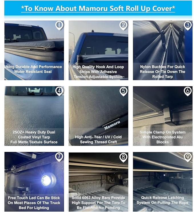 - *Eay Installation and Usage: Cover Placed On Top Of The Bed Rails,With Quickly Clamps To Fix.No Drilling,Only Needs 15-20 Minutes for installation,Need To Remove Any Accessories On The Bed Rais Such As Cargo Rack;Simple Usage by Pushing Or Pulling The Lock On The End, And Roll Up and Down The Tarp.