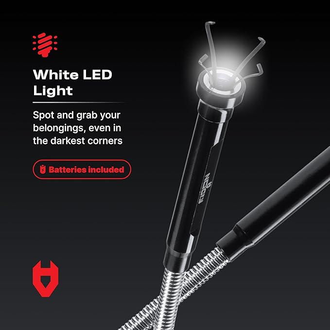 - BRIGHT WHITE LED LIGHT. The 3mm light helps you see wherever you reach. And, if you are reaching into mucky corners, cleaning your flexible grabber tool afterwards is easy. Just use water and a mild detergent. Remember to avoid getting the batteries wet though!