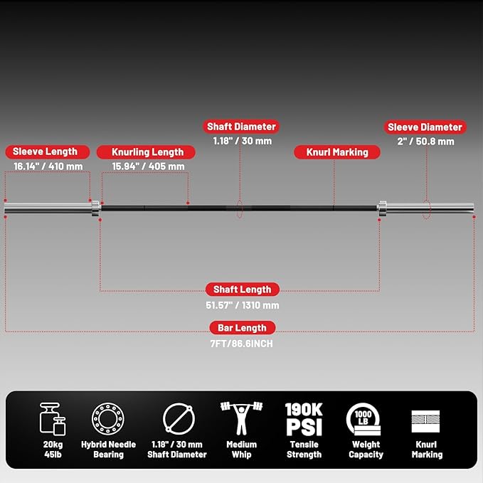 - Textured 2-Inch Sleeves – Anti-Scratch & Universal Compatibility: The sleeves feature grooves to prevent plate scratches and fit all Olympic plates. Compact 7ft design saves space while maintaining a 45 lb balanced weight.