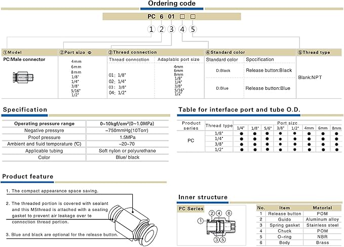 - 10mm Air Fittings Working Pressure:0-1.0mpa | 0-150psi; Proof Pressure:3.0Mpa | 435psi; Negative Pressure:-100Kpa | -29.5 In Hg