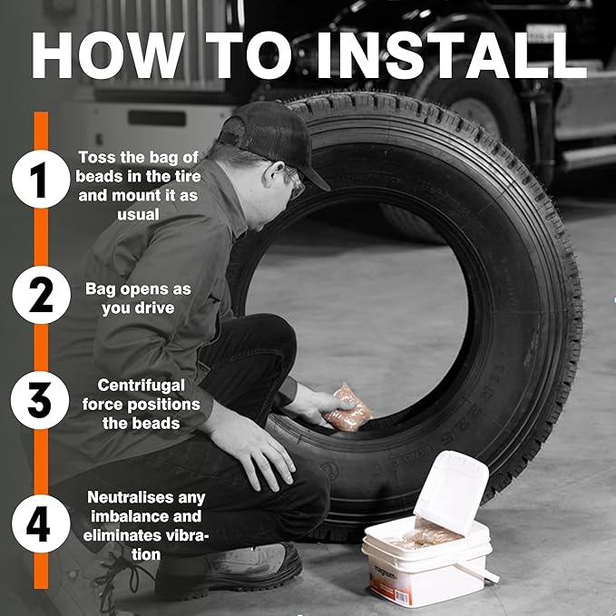 - Case with individually packaged bags containing the toss-in insert bag of tire balancing beads.