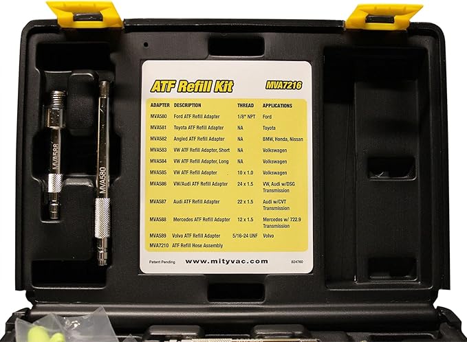 - COMPREHENSIVE ATF REFILL SOLUTION: The Mityvac MVA7216A is a versatile accessory kit designed to convert the MV7201 fluid extractor into a professional-grade ATF refill system, allowing seamless dispensing of transmission fluid for both foreign and domestic vehicles