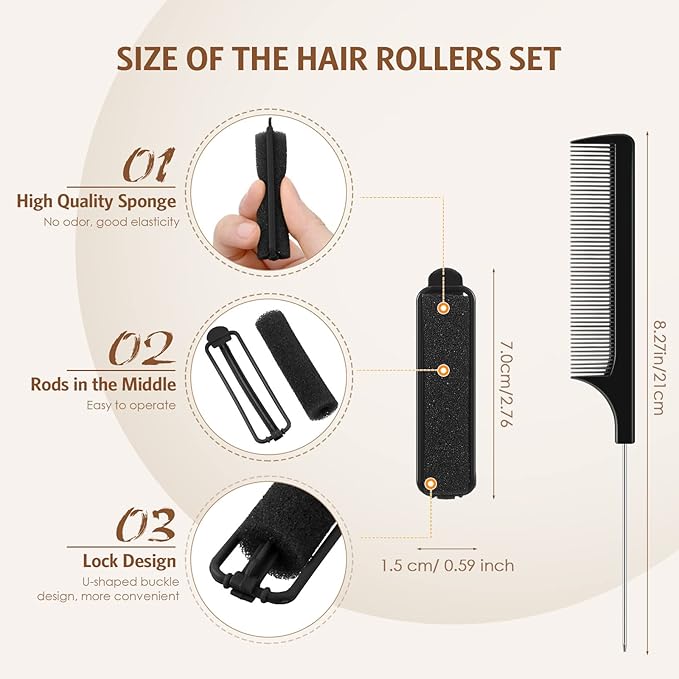 - Package Includes: you will get 42 pieces foam sponge hair curlers, each hair curler measures approx. 7.0 cm/ 2.8 inches long and 1.5 cm/ 0.59 inch in diameter, combined with 1 piece stainless steel rat tail comb, which is approx. 21 x 2.5 cm/ 8.27 x 0.98 inches in length and width, nice combination for your hair styling