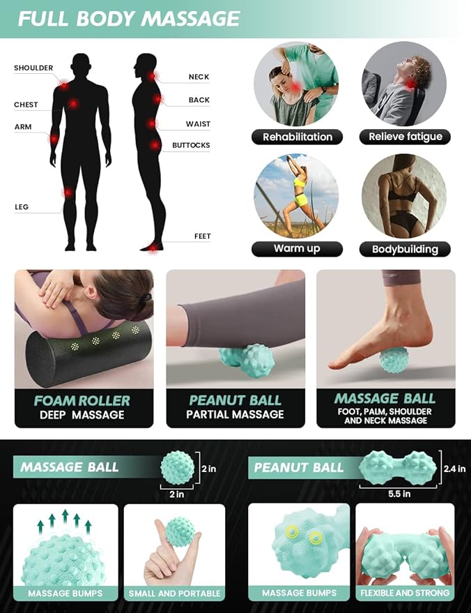 - 【HIGH-DENSITY FOAM ROLLER】 Foam roller rolling creates pressure to release trigger points and loosen knots in muscles and improve overall flexibility, especially in commonly tight areas such as the back, calves, IT band, hamstrings, lats, and glutes. It is ideal for use in physical therapy, before and after exercise, yoga and massage therapy.