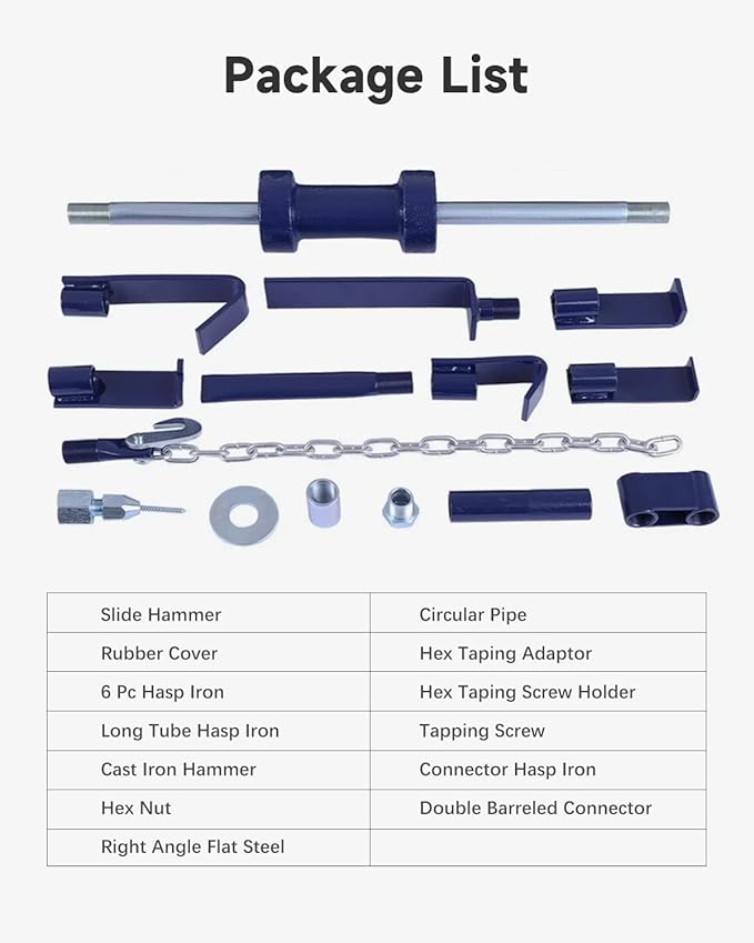 - 【PACKAGE INCLUDED】 - Complete 18-piece set for a variety of pulling applications including: sliding hammer, rubber cover, 6-piece snap iron, long tube snap iron, cast iron hammer, hex nut, right angle flat bar, round pipe, hex tape adapter , hexagonal tape screw holder, self-tapping screw, connector buckle iron, double tube connector, carrying case