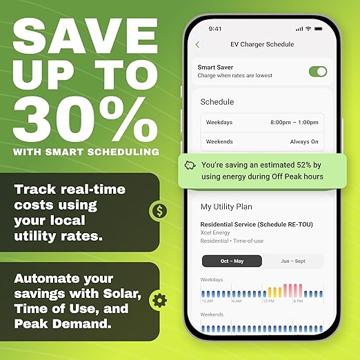 - Get the Benefits of Smart Charging: Connect via 2.4 GHz WiFi to access real-time energy data and manage charging from your mobile device. Schedule charging sessions to optimize utility rates and performance.