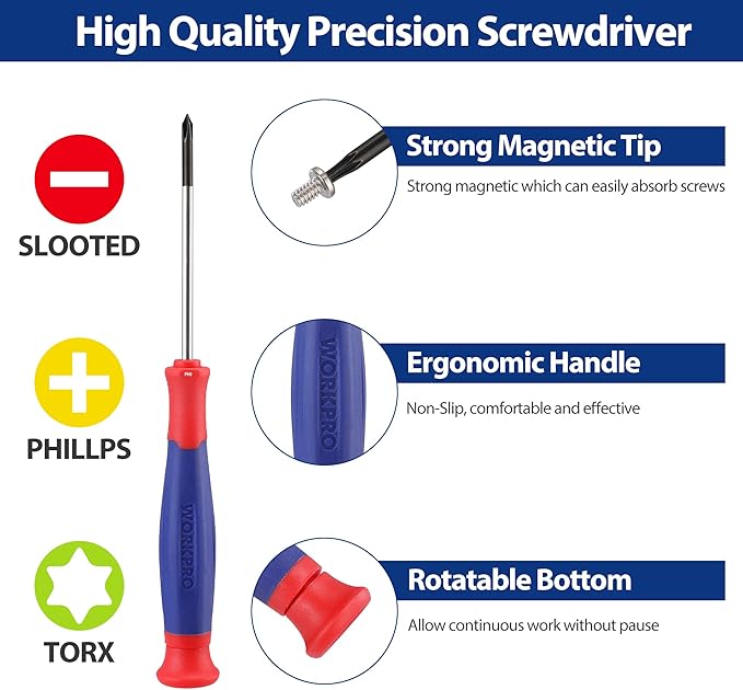 - 10PCS Precision Screwdriver Set: 10 different sizes of screwdrivers to meet various needs: 4PCS Slotted screwdriver: 1/16", 5/64", 3/32", 1/8"; 3PCS Phillips screwdriver: PH000, PH00, PH0; 3PCS Hexagon socket head screwdriver: T7, T8, T9. The screwdriver is made of heat-treated CRV, which greatly increases durability and extends service life. Precision magnetized tips increase efficiency. Hold the fasteners easily to start tightening and prevent the fasteners from falling out when unscrewed