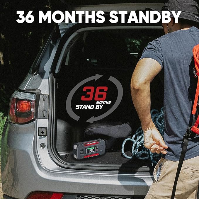 - 36 Months Standby Time: This jump starter is designed with DC input port (60W Max) and equipped with cigarette lighter adapter, which allows you charge the jump starter while driving. A full charge takes only 45 minutes. Jump pack has an impressive 36 months standby time, thanks to its use of 80C high-rate batteries with an ultra-low self-discharge rate of 0.69mAh. In order to extend the battery service life , please charge it before first use and charge the device every three months.