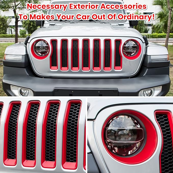Front Grille Mesh Inserts & Headlight Cover for Jeep Wrangler JL JLU Sport & Sport S Only 2018-2023 Exterior Accessories Clip-in Grille Guard Cover Headlight Bezels Trim Ring (Red 9PCS)