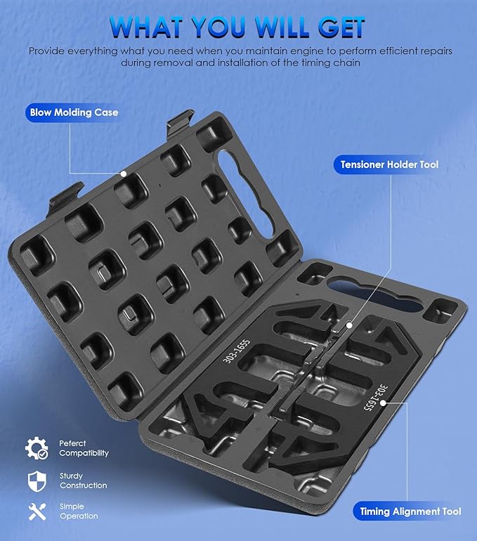 - 【PORTABLE DESIGN】: A complete kit which are cabinet and easy to carry. Comes with a mold-plastic case, convenient to store. Includes 2 x camshaft holding tools, 1 x tension tool. This compact and portable design provides convenience for emergency timing chain maintenance.