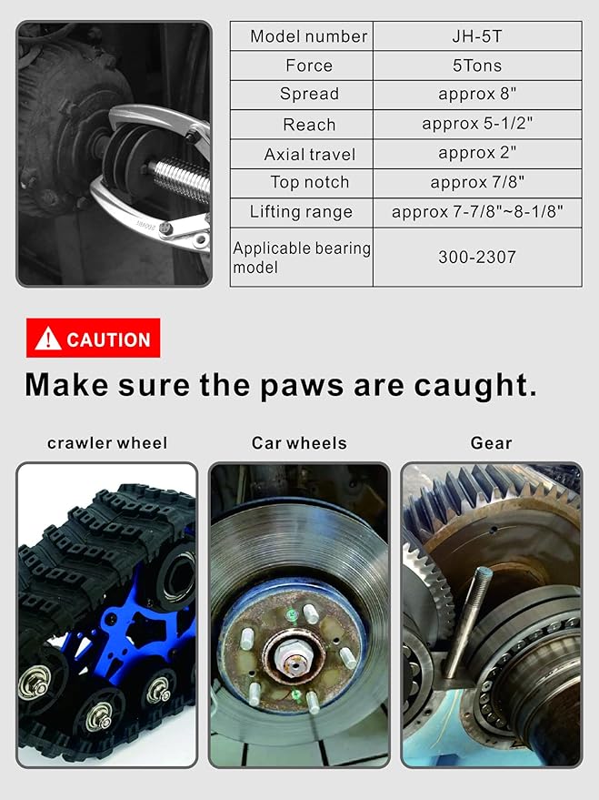 - Strong compatibility: The 5-ton hydraulic gear puller can be operated horizontally or vertically without site restriction. It has2" (50 mm) axis travel with 5.5" (140 mm) max reach and 8" (200 mm) max spread.