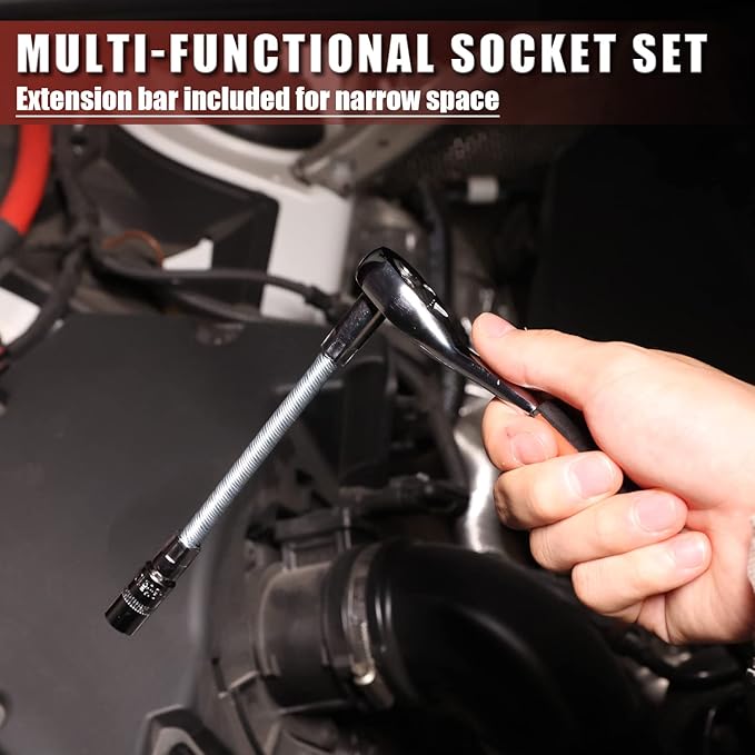 - Multi extension bars: Small socket set included multi extension bars is suitable for various scenarios: 1pc 1/4"dr universal joint, 1pc 1/4"dr × 2" extension bar, 1pc 1/4"dr × 4" extension bar, 1pc 1/4"dr × 6" flexible extension, 1pc 1/4"dr sliding t-bar, 1pc-1/4" DR × 4" extension bar, 1pc 6" spinner handle, 3pc-hex wrenches and 1pc-bit adapter.