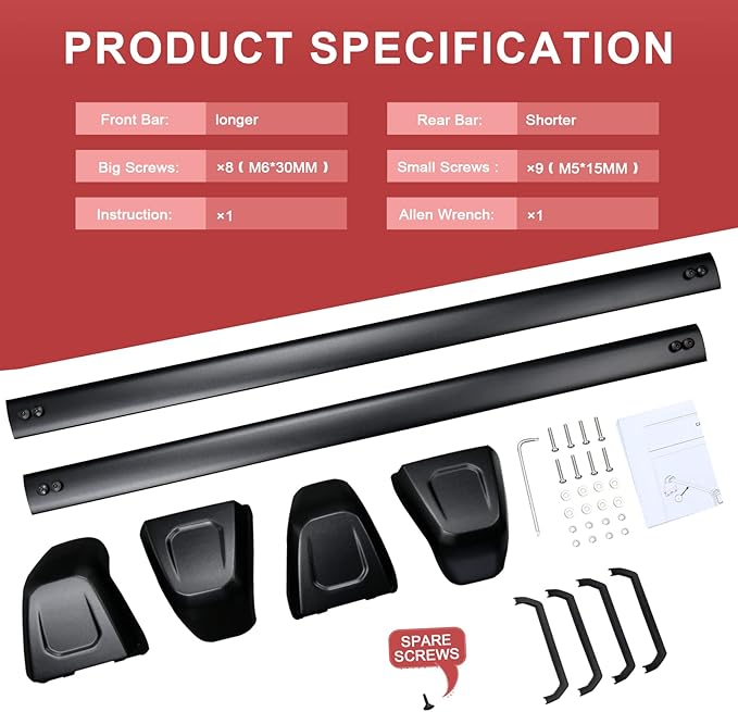 - 【Easy to Install on Vehicle】 Come with necessary installation tools, and easy to assemble and disassemble in a few minutes. The width of this crossbar can be adjusted. Labeled front and rear so no guessing on which one goes where. The front crossbar is longer than the rear to accommodate vehicle size.