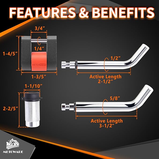 - TRAILER RECEIVER LOCK – Metoware trailer hitch lock has dual bent pin and designed for easy operation. With the push-to-lock design, you can easily push to lock it without using key. To open it, just turn the key a little bit and the pin will pop out by itself. And the dust cap aims to keep the keyhole away from water and dirt, great design for easier using.
