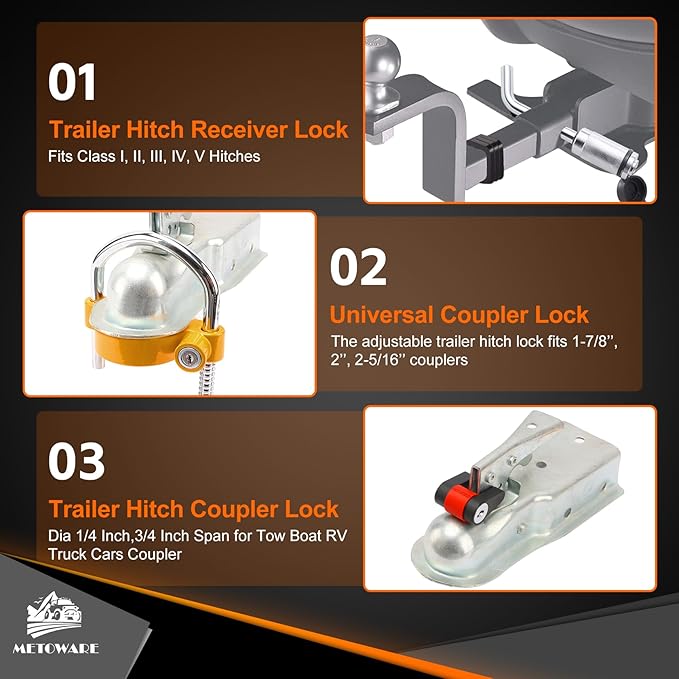 - TRAILER HITCH LOCK KIT – Our trailer hitch lock set including 1pc 1/2” and 5/8” Diameter Dual Bent Pin Anti-Theft Trailer Hitch Lock, 1pc 1/4” Dia Trailer Coupler Lock with 3/4” Inch Span, 1pc Universal Ball Coupler Lock Fits 1-7/8",2”, 2-5/16" Coupler (Keyed Alike)