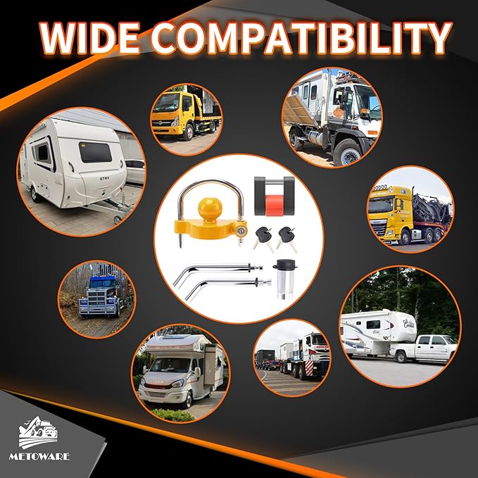 - EFFECTIVE DETERRENT– The trailer lock set is painted striking yellow color can provide high visibility combines with the last anti-theft technology. The ball hitch lock should be an effective deterrent for most of us, even in areas with high crime rates.With this coupler lock to prevent theft,keep your precious cargo stays safe.Greatly reduces the possibility of your RV being targeted by thieves. A set of three trailer hitch locks share the same key.
