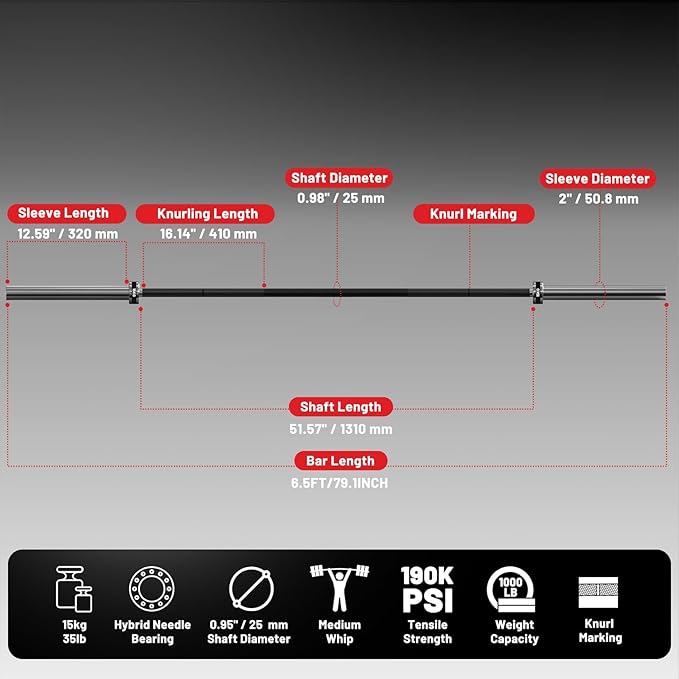 - Textured 2-Inch Sleeves – Anti-Scratch & Universal Compatibility: The sleeves feature grooves to prevent plate scratches and fit all Olympic plates. Compact 6.5ft design saves space while maintaining a 35 lb balanced weight.