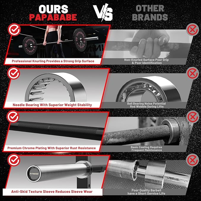 PAPABABE Olympic Barbell, 2-inch 45lb/35lb Weight Bar for Strength Training. 6.5ft/7ft Olympic Bar, 1000lb Plus Capacity, Chrome/Zinc Plating, knurled Grip for Bench Press Deadlift Squat