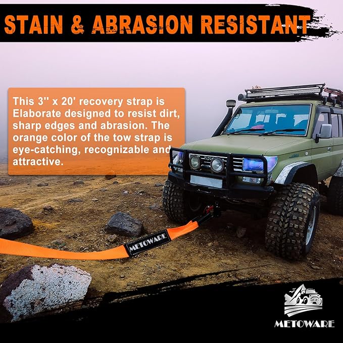 - Durable Construction: Made from high-quality polyester, Metoware recovery strap features a reinforced weave to prevent fraying, providing you with a long-lasting and reliable towing solution.
