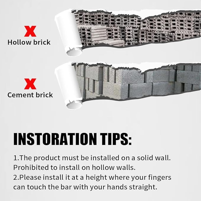- 【Wall Mounted Requirements】Concrete wall, brick wall or solid tile wall is suggested for mounting this chin up bar. Please DON'T install it on drywall, honeycomb brick wall, plaster walls, sandwich panel and cavity. Full instructions & all mounting hardware are included.