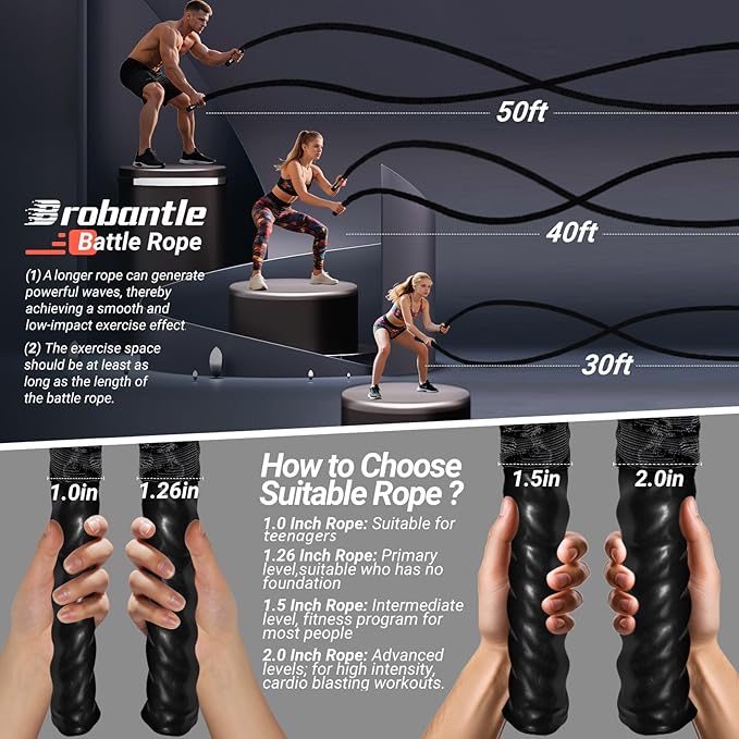 - Suitable For All Levels And Can Be Used For Different Training Purposes: Exercise rope has three thicknesses of 1.26 inches, 1.5 inches, and 2 inches, with a length of 30 feet. The 1.26"-30FT one weighs 9.5 pounds, which is suitable for beginners to conduct daily exercises at home; the 1.5"-30FT one weighs 14.5 pounds, suitable for intermediate - to - advanced professional fitness enthusiasts; the 2"-30FT one weighs 23.5 pounds, suitable for advanced professional fitness people.