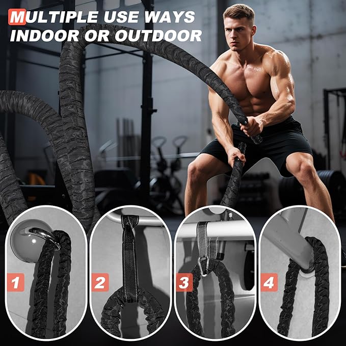 - Fitness Rope With Multiple Usage Modes: Whether it's for home fitness or outdoor sports, is an excellent choice.The training rope can be used for up - and - down, pulling or climbing movements - combat ropes, exercise ropes, training ropes, fitness ropes, undulating ropes, adjustment ropes, climbing ropes, competition ropes, etc. If you are outdoors, you can directly use the accessories to tie it to a tree, a fixed pole, outdoor fitness equipment, or use the anchor we provide for fixation.