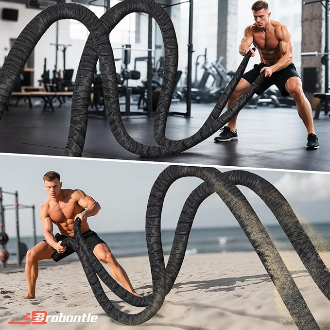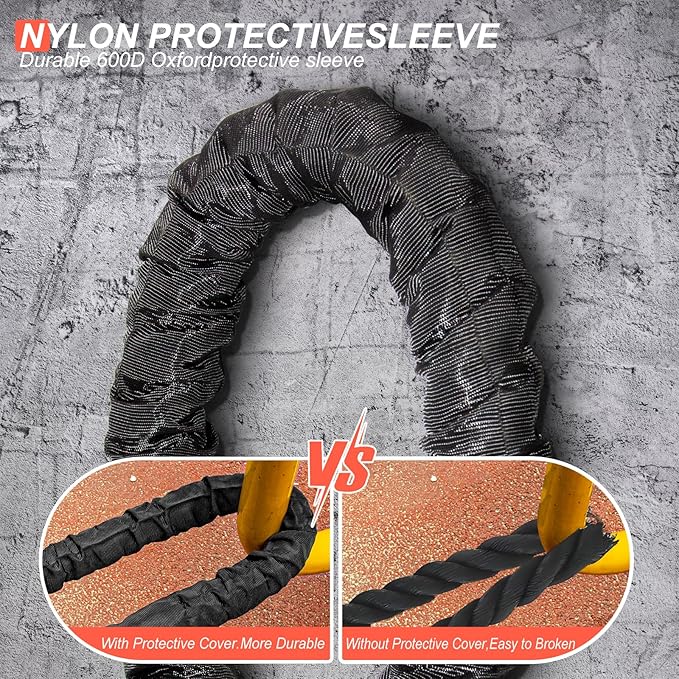 - Ultra-durable Structured Professional Battle Rope: The battle rope is made of durable three-strand 100% polyester filament material. A nylon protective cover is added on the outer layer. The high-tensile-strength exercise rope can prevent breakage, wear, or loosening, and is more durable than other exercise ropes without protective covers. This is a good choice for fitness enthusiasts for workouts in home gyms and outdoors.