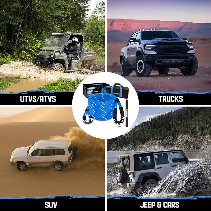 - 35% ELASTICITY: Smooth & Efficient Kinetic Recovery - The rope stretches up to 35% to store elastic potential energy, which transforms into kinetic energy during pulls. This design overcomes stuck vehicle resistance gently, avoiding harsh jolts that damage vehicles—making recoveries faster, smoother, and less stressful for both you and your off-road gear