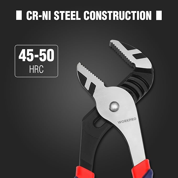 - Built to Last: WORKPRO groove joint pliers are made of high quality CrNi steel with high hardness and durability, black finished and polished for corrosion resistance and longer tool life.