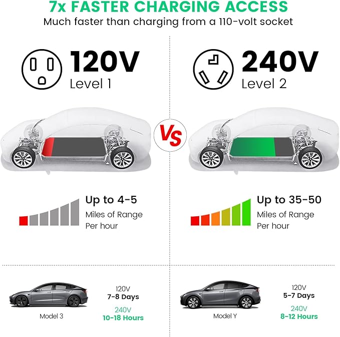 - COMPATIBILITY: Compatible with common electric vehicles and third-party chargers. This unit is built with NEMA 10-30 plug to two NEMA 10-30 outlets. It supports a maximum continuous load of 25 amps, a maximum safe charging rate of 24 amps, and a maximum power of 5.76 KW