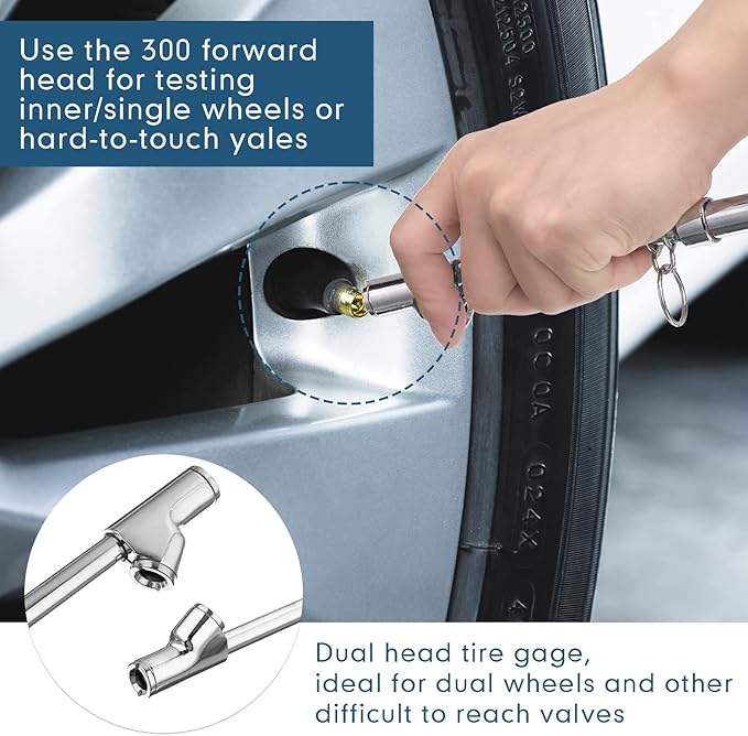 - Dual Head Design: the air pressure gauge for tires is designed with 2 push pull chucks, which fit inner wheels or valves that are difficult to reach, also can be applied for 30 degree reverse chuck for outer wheels, making it more convenient for you to measure tire pressure