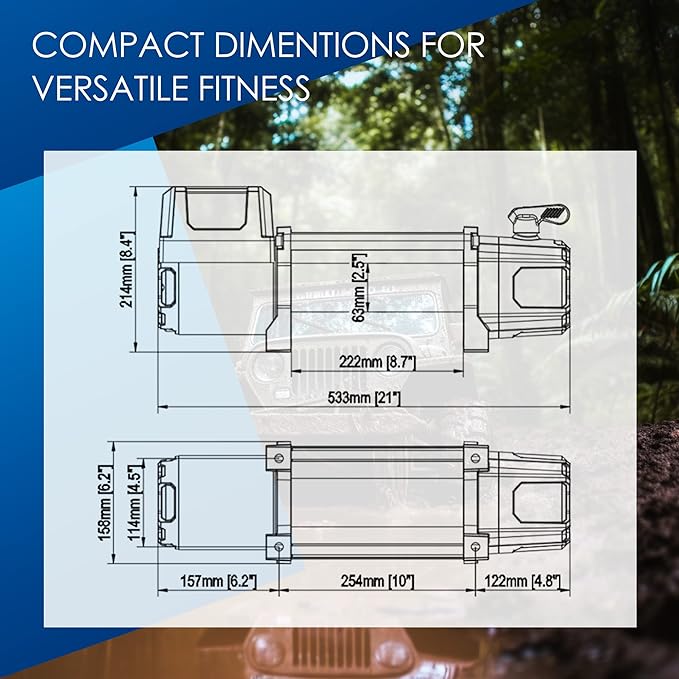 - Easy Installation & Compatibility - Compact design for easy installation on most vehicles, including Jeep, off-road trucks, and 4x4s. Please confirm the fit of the mounting plate before purchase: Mounting Bolt Pattern: 10"x 4.5" (254mm x 114.3mm), Mounting Hardware: Winch: 4×G8, M10-1.50×30mm; Fairlead: 2×G8, M12-1.75×25mm, A full set of mounting accessories and clear instructions ensure a hassle-free setup.