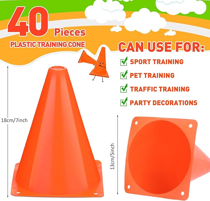 - Abundant Quantity and Bright Colors: the package includes 40 pieces of soccer cones for drills, measuring about 7 inches in height, and 5 inches in diameter, sufficient to satisfy your needs for a variety of training activities and parties