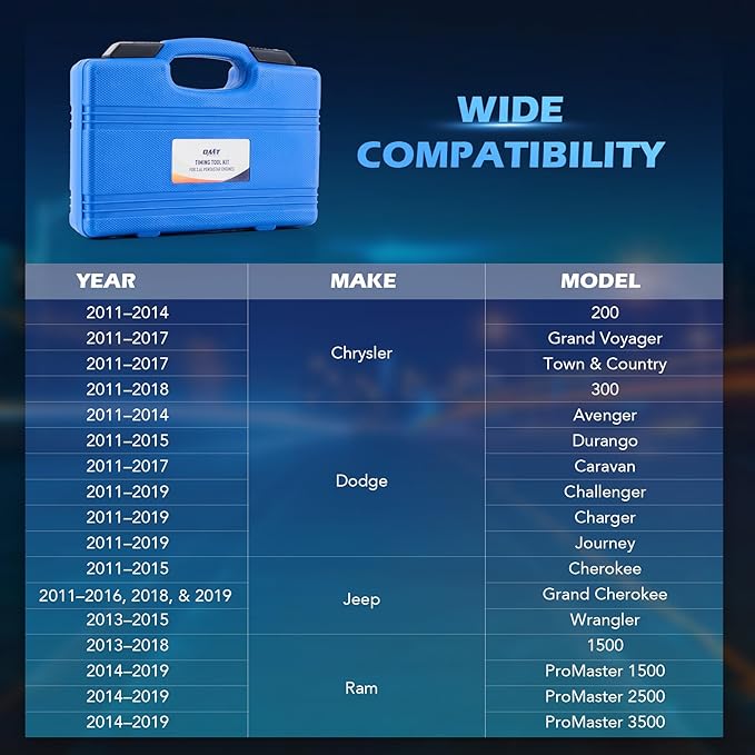 - Wide Compatibility: This versatile camshaft phaser timing chain lock tool set is compatible with most 2011 to 2019 Chrysler, Dodge, Jeep, and Ram 3.6L Pentastar engines with VVT systems (not compatible with VVL engines)