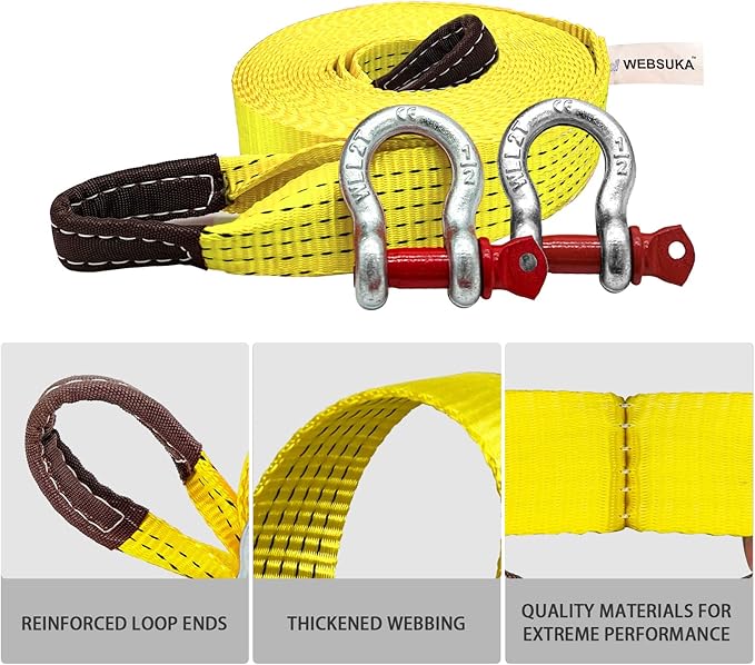- 【QUALITY MATERIALS】our tow strap with 2 Heavy Industrial drop-forged shackle,Made of Special Treated Carbon Steel,Sturdy and durable,You do not need to buy Industrial drop-forged buckles separately.Abrasion and weather resistant industrial polyester yarn strap will not rot or tear in extreme conditions.Suitable for bad weather, windy,rainy or snowy days.We've also bundled an storage bag to hold all vehicle accessories.