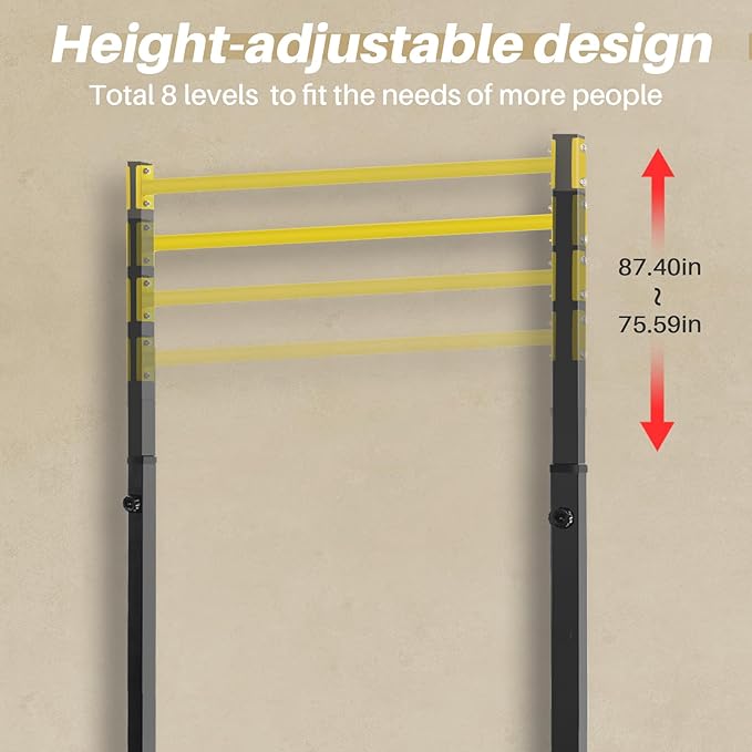 - 【8 ADJUSTABLE POSITIONS】Pull-ups have 8 levels of adjustment, with a minimum height of 59inch and a maximum height of 85inch, and a hole spacing of 1.97inch. Pull up bar station can be used by adults and children at home.