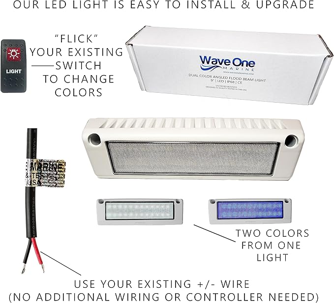 - INTERNAL DRIVER (EASY TO UPGRADE): Others lights use external drivers or three wires creating a need for a three way switch and additional wiring. Not Ours. Easily upgrade to our dual color tech using your existing + / - wire and original switch. Simply "flick" your switch on-off-on to switch colors. Multiple lights can be joined together to match. Popular blue accent color for a cool modern effect great for entertaining at the campground or dock.