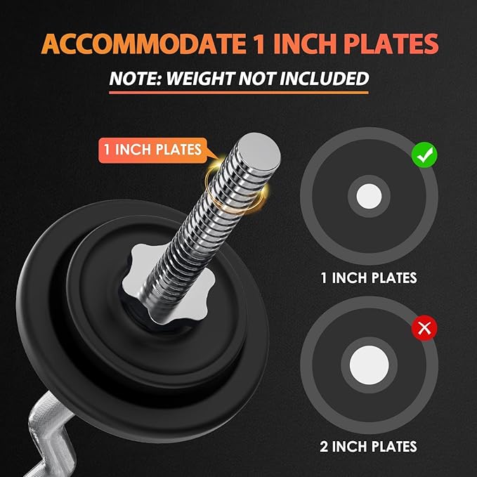- 💪NON-SLIP DIAMOND KNURLS - The diamond-shaped knurls are designed to provide you with excellent grip, slip resistance, and the depth of the knurl is just right, so it won't be too hard and tear your skin. Comes with 2 steel swivel sockets to hold 1" weight plates.