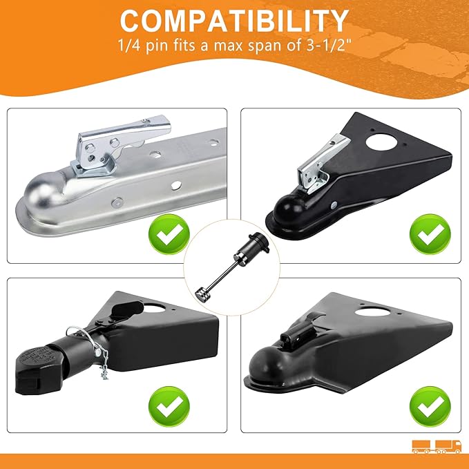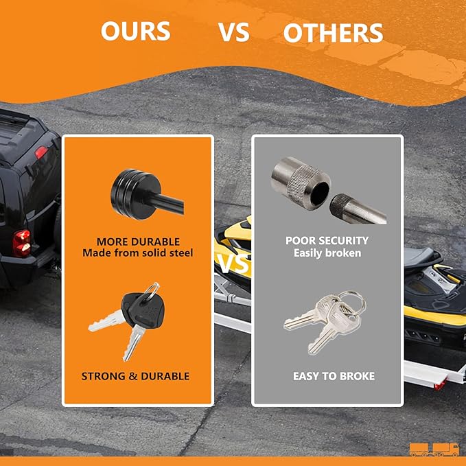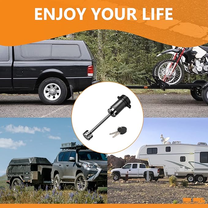 - 【PACKAGE INCLUDES】- This trailer coupler lock comes with 1x lock pin (1/4" diameter ) , 1x lock head (360°rotating design& water proof rubber cap), 2x copper keys (one for standby). NOTE: Please check the second image on the details page to see if it meets your needs.