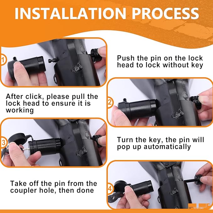 - 【PUSH-TO-LOCK DESIGN】- Upgraded trailer coupler lock is designed for easy operation. With the push-to-lock design, you can easily push to lock it without using key. Just turn the key a little bit and the pin will pop out by itself.
