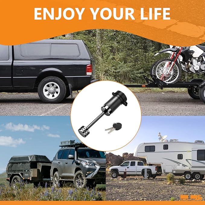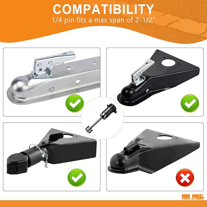 - 【PACKAGE INCLUDES】- This trailer coupler lock comes with 1x lock pin (1/4" diameter ) , 1x lock head (360°rotating design& water proof rubber cap), 2x copper keys (one for standby). NOTE: Please check the second image on the details page to see if it meets your needs