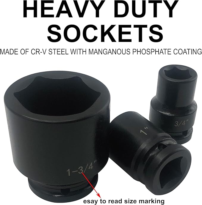 - 【29 Sockets Included】 This effort-saving SAE 3/4 inches drive impact socket set comes with 29 impact drive sockets: 3/4", 13/16", 7/8", 15/16", 1", 1-1/16", 1-1/8", 1-3/16", 1-1/4", 1-5/16", 1-3/8", 1-7/16", 1-1/2", 1-9/16", 1-5/8", 1-11/16", 1-3/4", 1-13/16", 1-7/8", 1-15/16", 2", 2-1/16", 2-1/8", 2-3/16", 2-1/4", 2-5/16", 2-3/8", 2-7/16", 2-1/2".