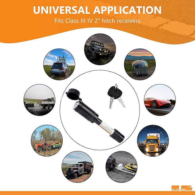- 【UNIVERSAL COMPATIBILITY】- 5/8" diameter and 2-3/4” long trailer hitch locks fits most class III IV 2” hitch receivers. The hitch lock also can be used for tray tow rope of trailer, truck, car, bike and boat. Notice: It not compatible with double-walled receiver tubes. (Please make sure of the size of the lock or email us for more information before placing an order)