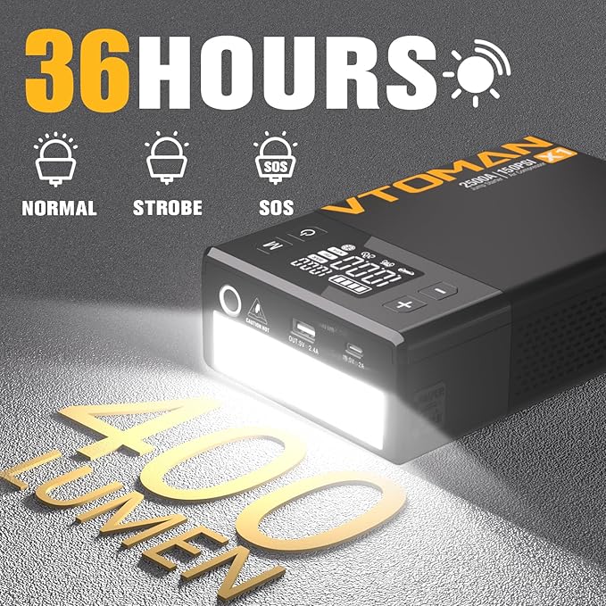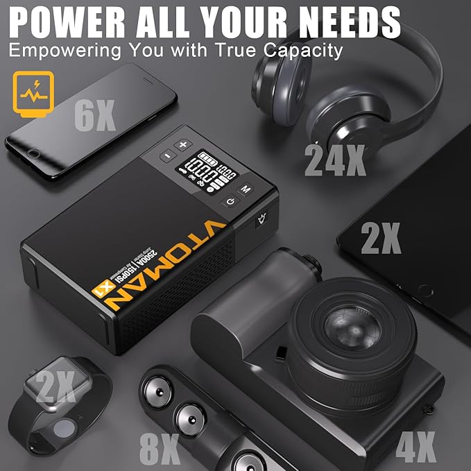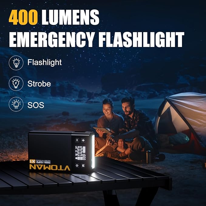 - Versatile and Wide-Compatibility Car Battery Starter - This VTOMAN X1 lithium battery car starter integrates multiple practical functions. It is not only a portable car jump starter, but also has tire inflation, pressure gauge, portable power box, 3 modes of lighting (flashlight, strobe light, SOS), dual USB fast charging function. Suitable for roadside crises, outdoor adventures and daily commuting, to meet your various needs