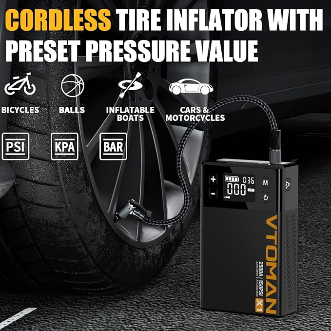 - Digital Cordless Air Compressor - The VTOMAN X1 jump box for car battery with air compressor has a built-in LCD digital meter. Most importantly, the X1 is equipped with a tire pressure detection function. You can preset the value( PSI, BAR, KPA) you want and it will automatically shut off when the pressure is reached. The 150 PSI air compressor takes about 2 minutes to inflate an average passenger car tire to 20 PSI and is suitable for bikes, passenger cars, balls, and other inflatables. Tire inflation time for different automotive fit type models: MODEL3 - 4MIN30S, MODELY - 4MIN35S, Jeep off-road - 6MIN7S
