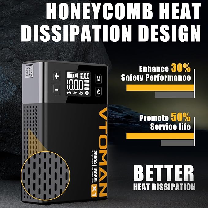 - Industry-Leading Thermal Innovation - Jump box and air compressor unique honeycomb heat dissipation design enables the X1 jump starter to obtain more powerful heat dissipation performance, so the safety performance of the X1 car jump starter is Enhanced by 30%, and its service life is promoted by 50% - making it the most tough emergency power solution for modern vehicles
