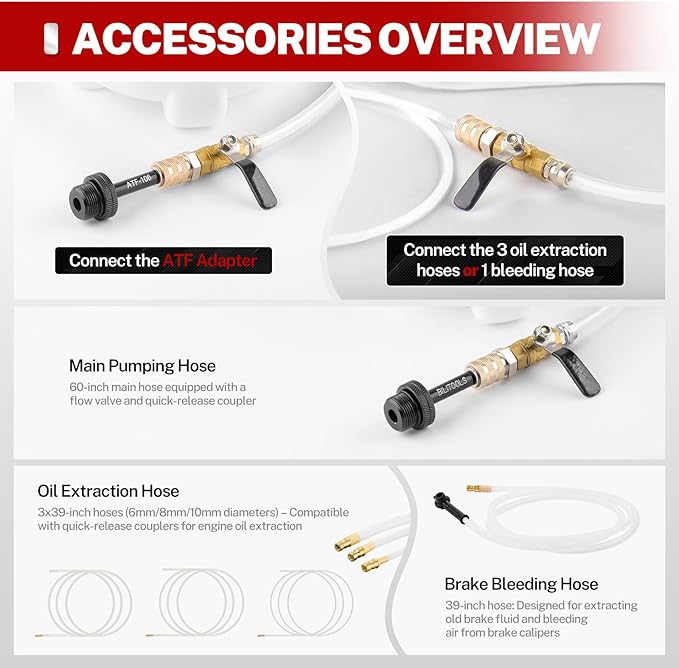 - SET INCLUDES: Pneumatic transmission fluid pump, all-metal 15pcs ATF filler adapters, 1x 60 inch main hose with control valve and quick-connector, 1x 39 inch flexible clear silicone hose (∅6mm), 2x 39 inch semi rigid nylon tube (∅8mm, ∅10mm), 1x 39 inch Brake bleeding hose