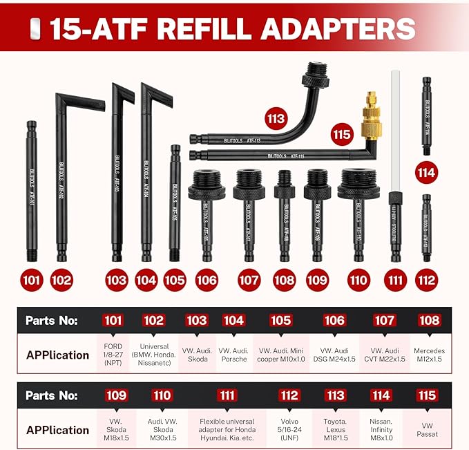 - UNIVERSAL COMPATIBILITY: Our transmission fluid bleeder set includes 15 ATF filler adapters, compatible with major brands like BMW, Porsche, Volkswagen, Honda, and Audi. A compact case ensures organized storage and portability for workshops or mobile service