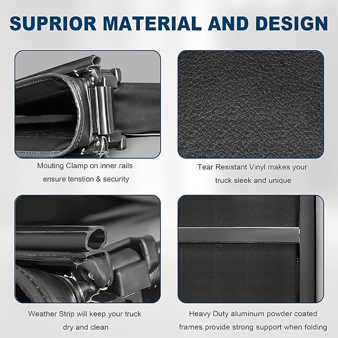 - High Quality: Tri-Fold Truck bed is made by double sided tear-resistant vinyl with heavy duty aluminum powder coated frames. It has 4 horizontal crossbars to ensure security and stability.