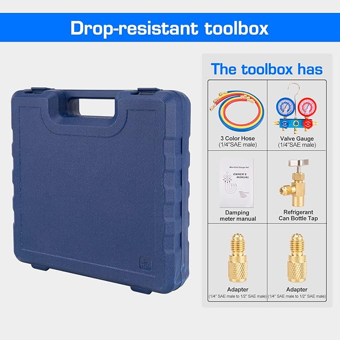 - 【AC Manifold Gauge Set】Manifold gauge set is designed specially to measure pressure in refrigeration equipment; Manifolds are equipped with large viewing glasses for easy viewing of refrigerant flow, and high-quality colorful pressure gauges ensure accurate readings; Portable plastic case is included. Color-coded hoses help identify the high-pressure side (red), low-pressure side (blue), and the filling hose (yellow); Flexible, durable and not easy to damage.